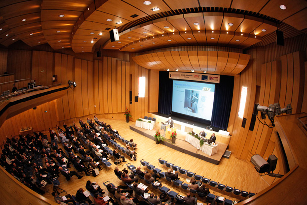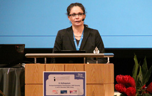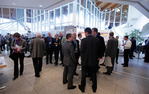 Prof. Kirsten Bobzin, Leiterin des IOT der RWTH Aachen und 1. Vorsitzende der GTS, referiert vor über 420 Teilnehmer aus 23 Ländern zum Thema Plasmaspritzen. | Viel Raum für Gespräche und Kontakte fanden die Teilnehmer in der direkt an den Vortragssaal angrenzenden Ausstellung. |