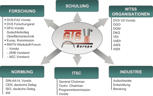 Dazu zählen z.B. die Durchsetzung von Interessen der GTS im Rahmen von Verordnungs- und Gesetzgebungsverfahren, dort im Besonderen auch bei Themen, die nur indirekt im Zusammenhang mit dem Thermischen Spritzen stehen, wie z.B. Neuerungen in Bezug auf Umwelt- und Arbeitsschutz. Die GTS versucht intensiven Einfluss bei der Vergabe von Fördergeldern im Rahmen der staatlichen Gemeinschaftsforschung zu nehmen, wirkt aktiv bei der Erstellung von Normen und Regelwerken mit, führt umfangreiche Weiterbildungsmaßnahmen in eigener Regie oder über Institute durch, gestaltet Fachtagungen mit Vorträgen und Ausstellungen. Gerade hier wird immer wieder deutlich, welche Vorteile die Gemeinschaft gegenüber den Einflussmöglichkeiten einzelner hat. Die GTS arbeitet sehr eng und erfolgreich mit dem DVS – dem Deutschen Verband für Schweißen und verwandte Verfahren e.V. in Düsseldorf – zusammen, hat aber seine Eigenständigkeit bewahrt.