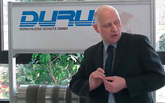 Am Sonntagabend wurde das Treffen durch ein gemeinsames Abendessen in gemütlicher Atmosphäre im Hotel „eingeläutet". Montagmorgen startete das Programm dann mit einer kurzen Begrüßung durch den Geschäftsführer der Firma DURUM Verschleiss-Schutz GmbH, Herrn Peter Knauf, der auch die Entstehungsgeschichte und den Werdegang der DURUM GmbH darlegte. Die weitere Leitung der Sitzung übernahm dann Herr Dr. Frank Schreiber, der ein sehr interessantes Referat über das Lichtbogenspritzen mit Fülldrähten hielt. Hier wurden auch die unterschiedlichen Möglichkeiten zur Herstellung von Fülldrähten erläutert und die Vor- und Nachteile der verschiedenen Herstellungsverfahren erklärt. Da die Fa. DURUM nicht nur ein Lohnbeschichter (insbesondere für PTA und Schweißprozesse), sondern auch ein Draht- und Pulverlieferant ist, konnten die technischen Unterschiede der verschiedenen Werkstoff- und Herstellungsverfahren sehr fundiert und anschaulich erklärt werden. Im eher praktischen Teil wurden die doch sehr zahlreich erschienenen Teilnehmer in zwei Gruppen aufgeteilt. Die erste Gruppe übernahm Herr Knauf, der die Pulver-, Draht- und Schweißanodenherstellung erklärte und in der Fertigung vorführte. Als mittelständiges Unternehmen ist DURUM sehr flexibel und kann in kurzer Zeit kundenspezifische Änderungswünsche bezüglich der Pulver- oder Drahtzusammensetzung umsetzen. Durch eine verfahrensbegleitende Qualitätssicherung kann in kürzester Zeit auf eventuell auftretende Unstimmigkeiten in der Produktion reagiert werden. Sehr interessant war das Herstellungsverfahren der vorher im Referat schon erwähnten Fülldrähte. Diese werden bei der DURUM GmbH auf selbst konstruierten und selbst gebauten Maschinen in einer hohen Qualität hergestellt.